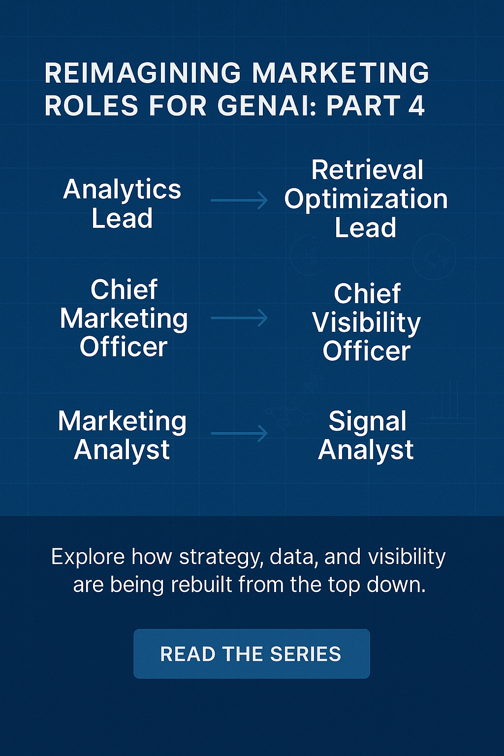 The modern CMO must now oversee a landscape where visibility isn’t just about brand awareness or lead gen — it’s about retrievability, trust, and grounded authority in AI-mediated environments. The Chief Visibility Officer owns the intersection of content, data, brand, and machine-readable infrastructure. This is the first executive role fully responsible for machine-facing brand readiness.
